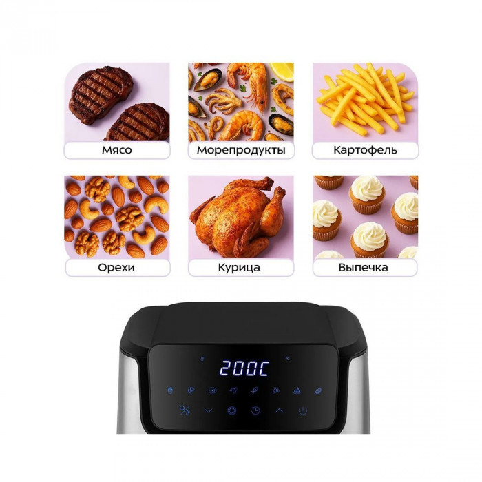 Внутри поддона (ёмкость 6,5 л) установлена решётка с антипригарным покрытием. Это позволяет готовить без масла и предотвращает прилипание продуктов. Решётка и поддон легко снимаются и моются, что делает устройство удобным в использовании.