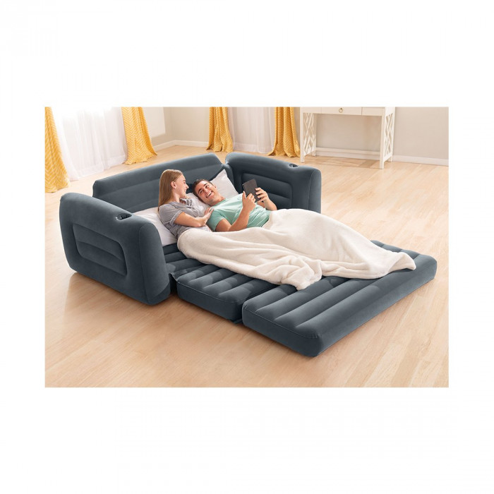 Диван-трансформер надувной Pull-out Sofa 203 х 231 х 66 см, INTEX, 66552NP, Винил, Встроенные подстаканники, 2 варианта сборки, Серый, Цветная коробка