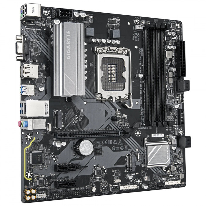 GIGABYTE B760M D3HP — материнская плата формата mATX на чипсете Intel B760 с сокетом LGA1700. Поддерживает до 4 модулей DDR5, слот PCIe 4.0, два M.2 накопителя и видеовыходы D-SUB (VGA), HDMI и DisplayPort (DP). Подходит для сборки домашних, офисных и игровых систем на базе процессоров Intel 12/13 поколения.