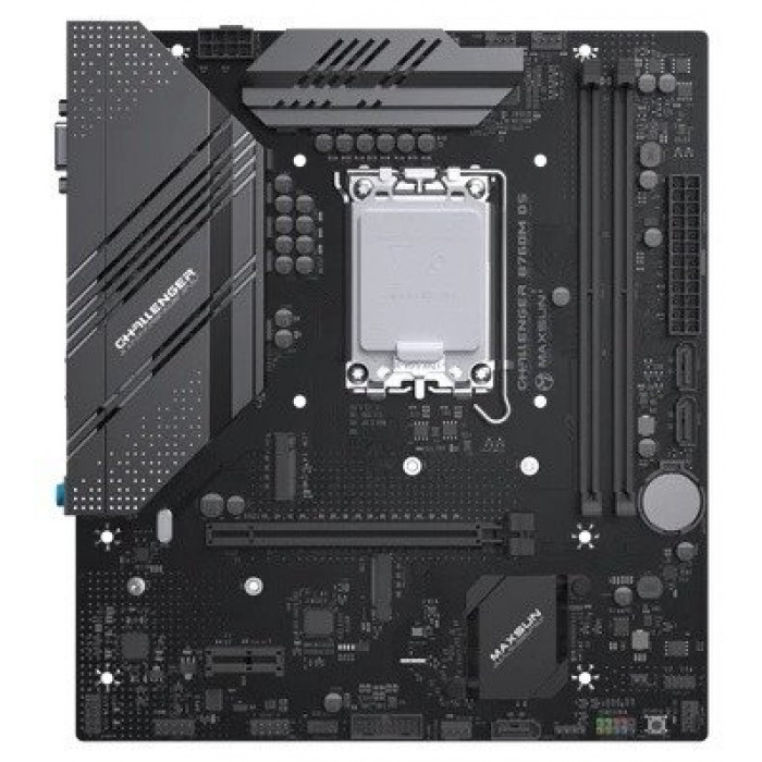 MaxSun Challenger B760M D5 — материнская плата формата mATX на чипсете Intel B760 с сокетом LGA1700. Поддерживает 2 модуля DDR5, два M.2 накопителя, 3 порта SATA и видеовыходы HDMI и VGA. Подходит для сборки домашних, офисных и бюджетных игровых систем на базе процессоров Intel 12/13 поколения.