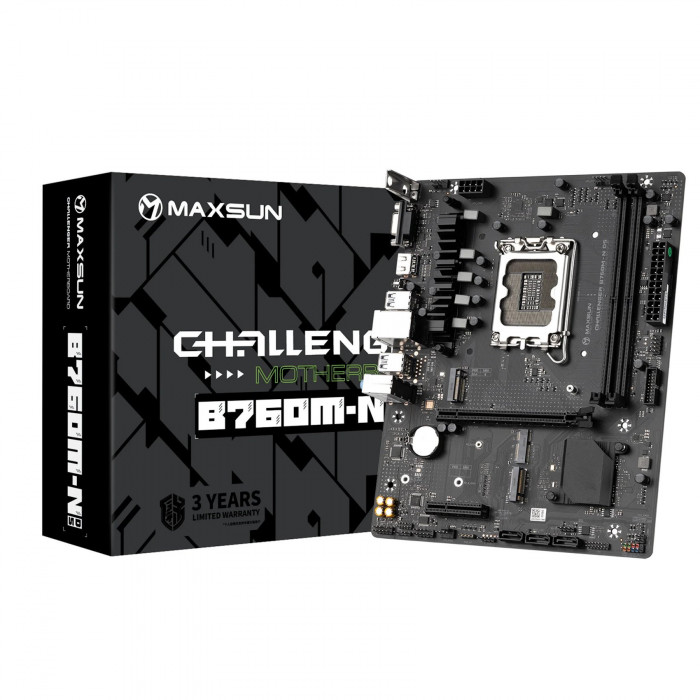 MaxSun Challenger B760M-N D5 — материнская плата формата mATX на чипсете Intel B760 с сокетом LGA1700. Поддерживает 2 модуля DDR5, два M.2 накопителя, три порта SATA и видеовыходы HDMI и VGA. Подходит для сборки современ... Читать далее...