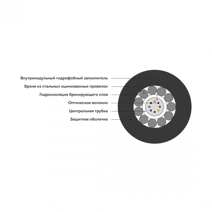 Конструкция волоконно-оптического кабеля ИКБ-Т с броней из круглой стальной проволоки для прокладки в грунт