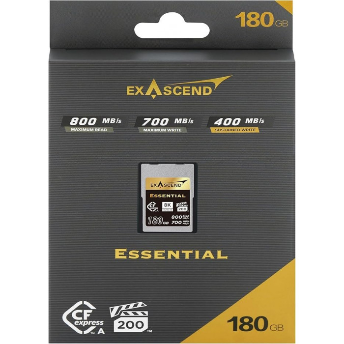 Карта памяти Exascend Essential CFexpress Type A 180 GB — высокопроизводительная CFexpress Type A‑карта с интерфейсом PCIe 3.0/NVMe 1.4, оснащённая 3D TLC флеш‑памятью и сертифицированная по VPG200 для записи 8K‑видео. Объём 180 ГБ, высокая скорость последовательного чтения до ≈800 МБ/с и записи до ≈700 МБ/с делают её подходящей для профессиональной фото‑ и видеосъёмки, включая видео высокой чёткости и быстрые серийные снимки.