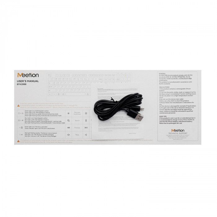 Meetion C2000 Black — беспроводной комплект «клавиатура + мышь» с мембранной клавиатурой на 109 клавиш и поддержкой EN/RU/KZ. Подключение осуществляется по 2.4G и Bluetooth, аккумулятор клавиатуры 300 mAh. Комплект подходит для офисной работы, учебы и повседневного использования.