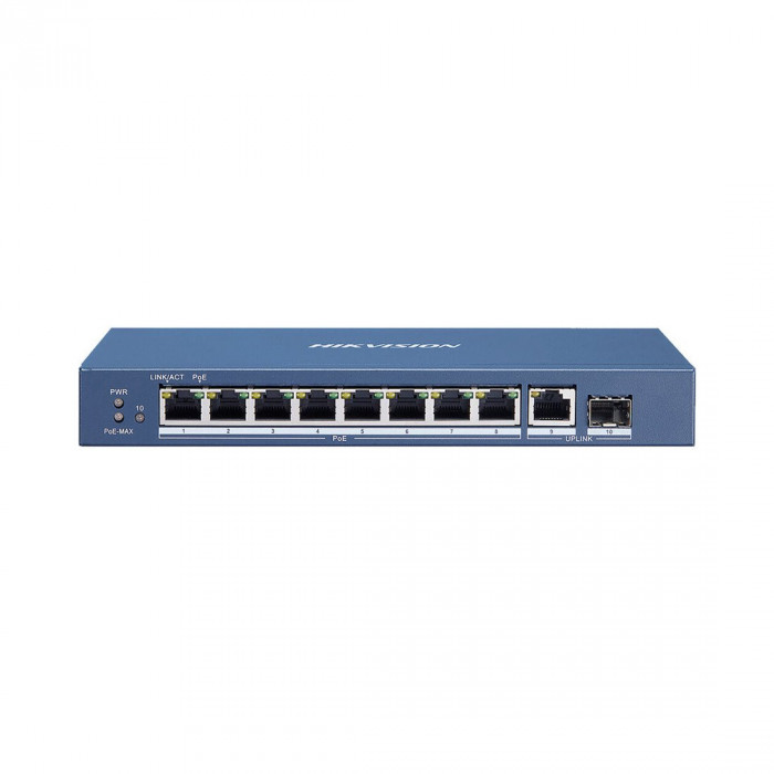 Коммутатор Hikvision DS-3E0510P-E(B)Порты: 8 × гигабитных PoE-порта, 1 × гигабитный RJ45, 1 × гигабитный оптический порт (SFP)Общий бюджет PoE: 110 ВтСовместимость со стандартами IEEE802.3af/at, макс. мощность на порт — ...