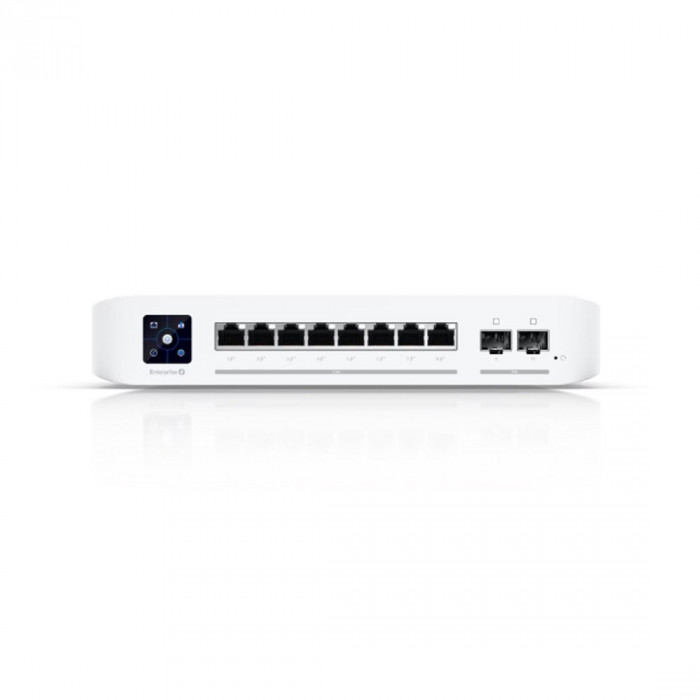 Сам же UniFi Switch Enterprise 8 PoE имеет автоматическое распознавание 802.3at PoE+ на всех 8 RJ45 портах, а так же оснащен двумя магистральными портами 10 Гбит/с SFP+ для присоединения к точкам доступа WiFi 6 и оптоволоконным линиям. Сенсорный жидкокристаллический дисплей 1,3" отображает текущее состояние и режим работы коммутатора. Используя его можно внести корректировки в параметры коммутатора, а также просмотреть некоторую статистическую информацию не прибегая к графическому интерфейсу.