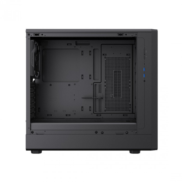 Корпус обеспечивает продуманную вентиляцию: предусмотрены места для установки нескольких вентиляторов и радиаторов СЖО, что позволяет поддерживать оптимальный температурный режим при высоких нагрузках. Просторное внутреннее пространство рассчитано на установку длинных видеокарт, высоких процессорных кулеров и накопителей различных форматов. Удобная организация мест для кабелей облегчает сборку и помогает сохранить аккуратный внешний вид системы.