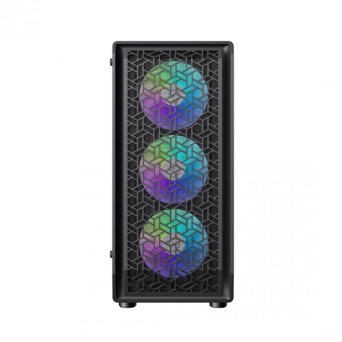 Функциональный корпус форм‑фактора Middle Tower, разработанный для сборки современных игровых и рабочих ПК с продуманной вентиляцией и современным дизайном. Чёрное исполнение корпуса создаёт строгий и универсальный внешний вид, который легко сочетается с любыми комплектующими и RGB‑подсветкой, делая систему визуально эффектной.