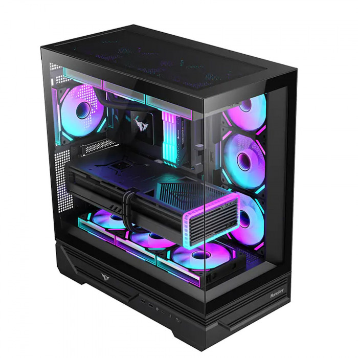 Huntkey MVP Destiny — компьютерный корпус формата ATX без блока питания, выполненный в чёрном цвете. Оснащён передней панелью с портом USB Type-C, двумя USB 3.0 и аудиоразъёмами HD-Audio. Корпус изготовлен из стали толщиной 0,7 мм и подходит для сборки современных игровых и универсальных ПК.