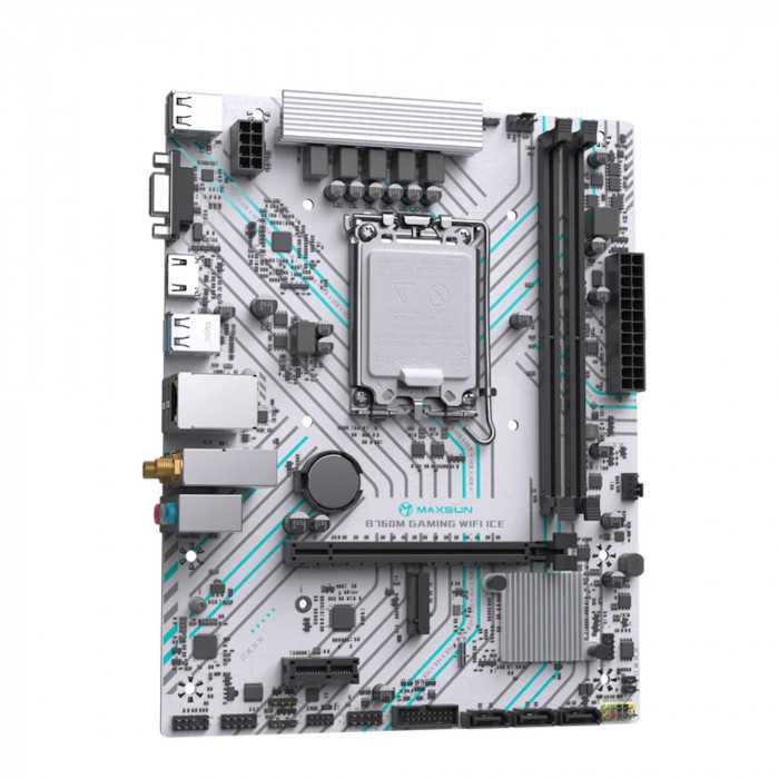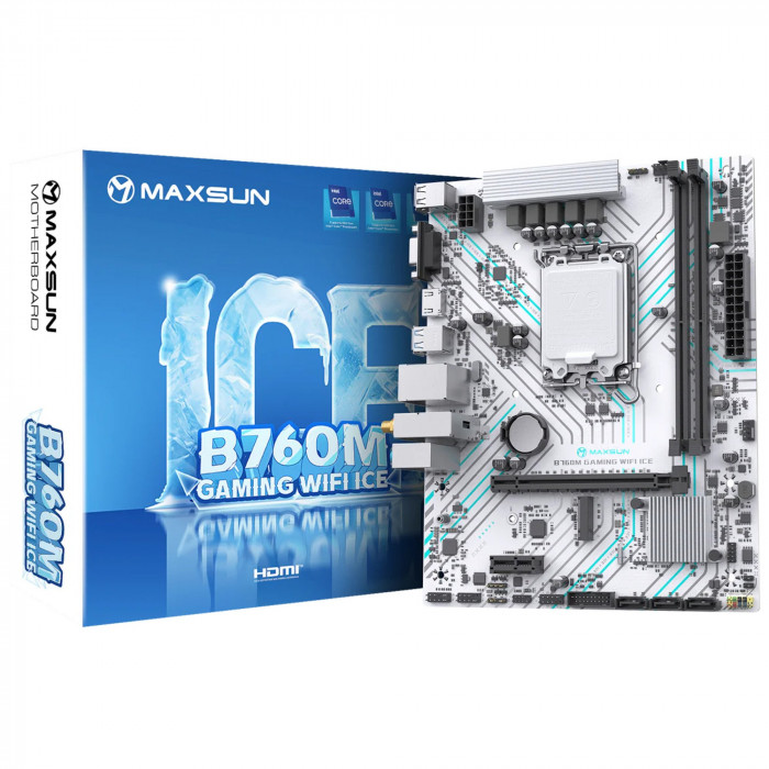Материнская плата MaxSun B760M GAMING WIFI ICE — игровая micro‑ATX плата на базе чипсета Intel B760 для процессоров с сокетом LGA1700, с поддержкой 2 × DDR4, интерфейса PCIe 4.0, встроенного Wi‑Fi, видеовыходами HDMI и DisplayPort, а также NVMe‑накопителя через M.2 — оптимальный выбор для игровых, мультимедийных и универсальных ПК без переплаты за лишние функции.