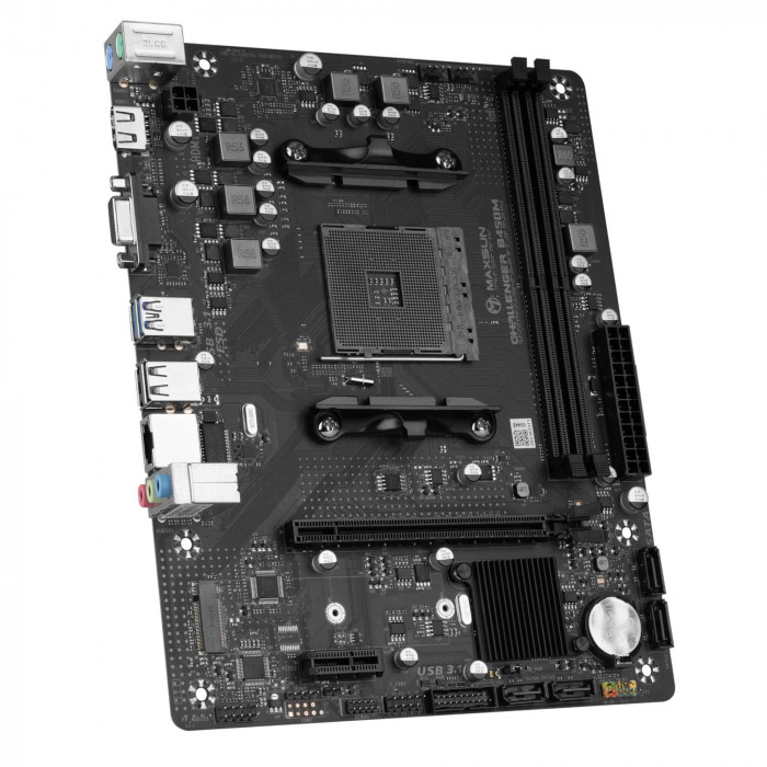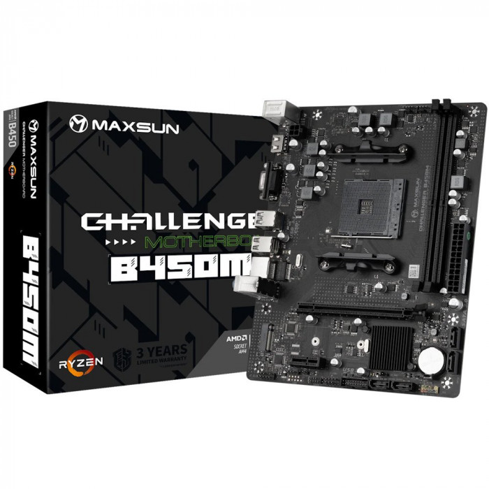 Материнская плата MaxSun Challenger B450M (V0) — универсальная micro-ATX плата на базе чипсета AMD B450 для процессоров с сокетом AM4, с поддержкой 2×DDR4, интерфейса PCIe 3.0, видеовыходов HDMI и VGA, M.2-слота и гибкими возможностями подключения — оптимальный выбор для домашних, офисных и бюджетных игровых ПК.
