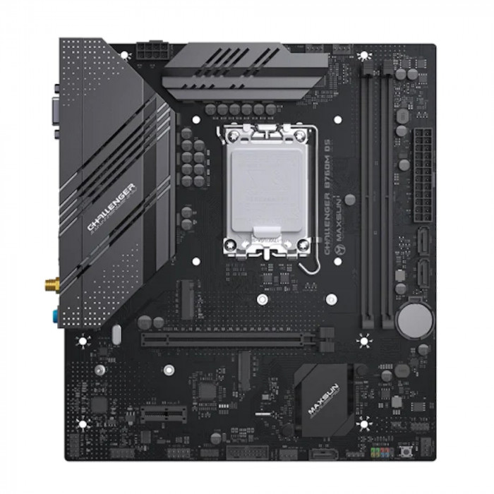 Материнская плата MaxSun Challenger B760M D5 WIFI — функциональная micro‑ATX плата на базе чипсета Intel B760 для процессоров с сокетом LGA1700, с поддержкой 2 × DDR5, 2 × M.2, 3 × SATA, встроенным Wi‑Fi, а также видеовыходами HDMI и VGA — отличный выбор для современных домашних, офисных и мультимедийных ПК.