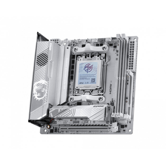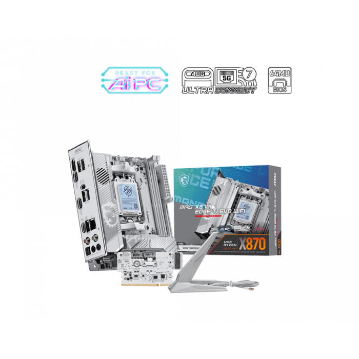Материнская плата MPG X870I EDGE TI EVO WIFI имеет серебристо-белый дизайн, ориентированный на любителей белых сборок ПК, которые хотят выделить свою систему. Её производительность соответствует внешнему виду: плата оснащена полноценным Wi-Fi 7, сетью 5G LAN, интерфейсом USB4 и поддержкой PCIe 5.0. Это лучшая ITX-плата на X870 в белом цвете для процессоров AMD Ryzen™ 9000 серии.