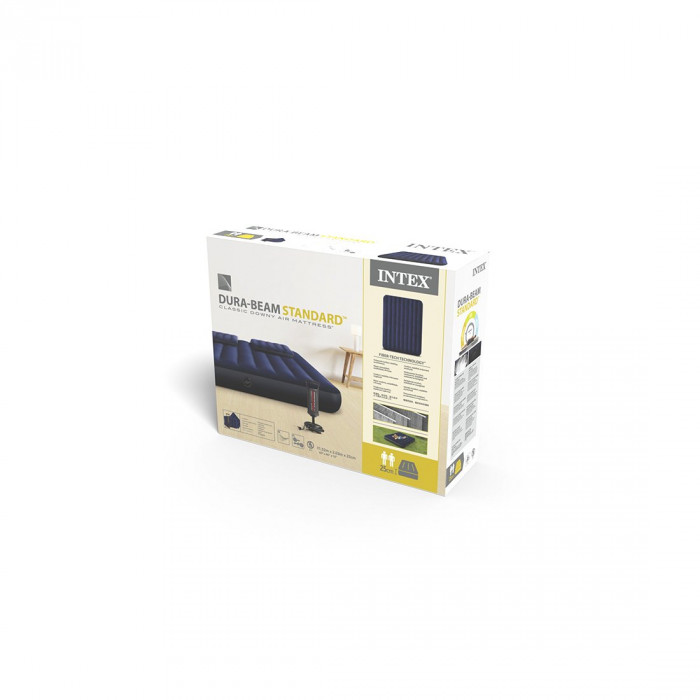 Матрас надувной Dura-Beam Classic Downy Airbed (Queen) 203 х 152 х 25 см с насосом и подушками, INTEX, 64765, Винил, Флокированый верх, Технология Fiber-Tech, Насос 68612 и 2 надувные подушки в комплекте, Синий, Цветная коробка