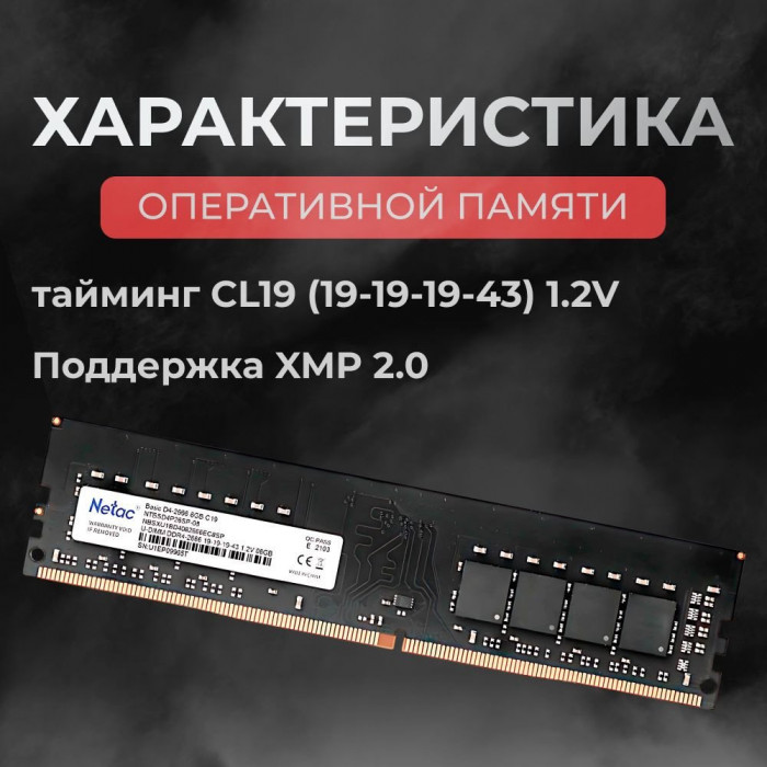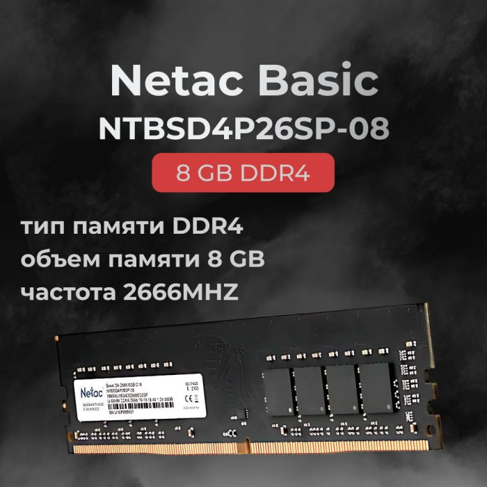 Модуль памяти Netac Basic, NTBSD4P26SP-08, DDR4 DIMM, 8Gb, 2666Mhz, C19