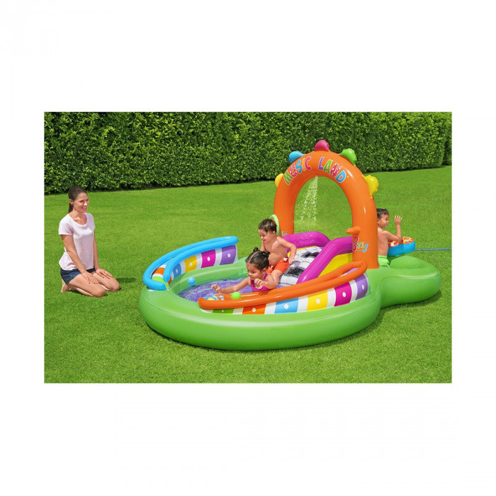 Зажгите этим летом с Bestway Sing 'n Splash Play Center! Дети могут исследовать свою музыкальные способности и плескаться на солнышке благодаря обширным игровым возможностям и всем надувным музыкальным инструментам. Этот игровой центр включает в себя микрофон и барабан, с которыми дети могут играть, вдохновляя их на использование своего воображения. Двойной бассейн обеспечивает несколько игровых площадок,они соединены между собой съемной горкой. Пол бассейна имеет надувную подушку для дополнительного комфорта, когда дети скользят вниз. Арка игрового центра оснащена разбрызгивателем, который обольет и детей, и горку, а также включает в себя веселую игру «Кольцеброс», чтобы дети могли поиграть. Дети также могут катить прилагаемые игровые шарики вниз по каждой из двух дорожек снаружи игрового центра, что позволяет им весело проводить время, работая над развитием зрительно-моторной координации и ловкости рук. Просто прикрепите садовый шланг, чтобы начать веселье!