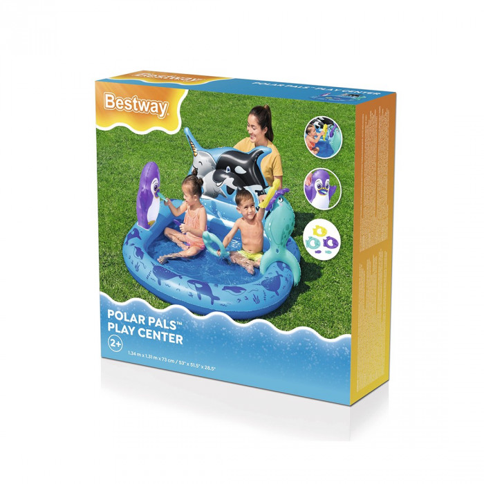 Приготовьтесь к «прохладному» лету веселья с игровым центром Bestway® Polar Pals™! В игровом центре Polar Pals с дружелюбными арктическими животными есть большая игровая площадка с бассейном, в которой есть игра с бросанием надувных колец с 2 возможными мишенями. Дети в возрасте от 2 лет и старше могут целиться в рог нарвала или бросать кольца в форме рыбок на надувного тюленя. Чтобы увеличить сложность броска кольца, тюленя можно перемещать по игровому центру, чтобы создать большее расстояние до цели. Также в комплект входит надувной приятель-пингвин с 2 игрушечными рыбками из пеноматериала, с которыми дети могут плескаться или кормить ими пингвина. Игровой центр Polar Pals идеально подойдет для вашего переднего или заднего двора и может быть легко установлен; для этого его нужно просто подсоединить к ближайшему садовому шлангу. Убрать бассейн можно так же легко благодаря простому в использовании сливному клапану. Затем, когда игровой день закончится, бассейн можно сложить и хранить до следующего раза в течение многих сезонов. Исследуйте все развлечения, которые может предложить Арктика, с игровым центром Bestway Polar Pals.
