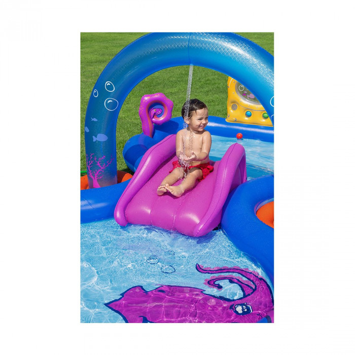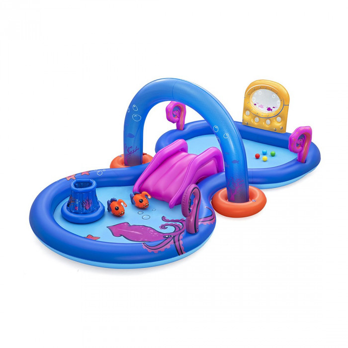 Приготовьтесь к глубокому погружению в веселье с игровым центром Bestway® Sea Odyssey™! Этот игровой центр, оформленный в тематике морских глубин, с 2-мя игровыми бассейнами, соединенными съемной надувной горкой, — воплощение подводных мечтаний вашего ребенка. Интерактивная стенка для сортировки мячиков заставит их почувствовать себя так, будто они находятся на подводной лодке, исследующей морские глубины. Они будут развивать свою мелкую моторику, помещая 4 игровых мячика в отверстия в стенке. Они будут плескаться часами, играя в пиклбол, используя 2 съемные ракетки в виде угрей и игровые мячики. Затем они смогут защитить свой корабль, используя пращу из щупалец кальмара, чтобы бросать игровые мячики в подвижную коралловую корзину. Когда дети захотят заняться нудлингом, они смогут схватить двух рыбок-удильщиков Puffy Pal™ и бросить их в коралловую корзину. Встроенный съемный арочный разбрызгиватель легко подключается к садовому шлангу, обеспечивая поток воды и хорошее времяпрепровождение. Игровой центр также имеет простой в использовании сливной клапан для выпуска воды из бассейна, поэтому его можно легко демонтировать и поместить на хранение для использования в будущем. Дети могут даже наслаждаться игровым центром без воды круглый год. Вашим детям понравится плескаться весь день и развивать свое воображение с помощью игрового центра Bestway Sea Odyssey.