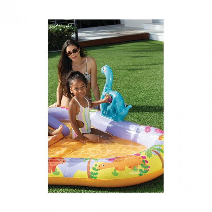 Детский надувной игровой бассейн Dino Park 201 х 157 см, INTEX, 56139NP, Винил, 159л., 2+, Горка, Разбрызгиватель в виде динозавра, Надувная фигура динозавра и другие аксессуары, Жёлтый, Цветная коробка