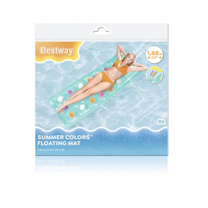 Плавайте и отдыхайте на стильном надувном матрасе для бассейна Bestway® Summer Colors™. Надувной матрас для бассейна имеет цветной прозрачный верх, под которым видны ярко окрашенные внутренние карманы. Карманы дают дополнительный всплеск цвета, а также сохраняют прохладу и обеспечивают дополнительную поддержку во время плавания. Надувной матрас для бассейна Summer Colors имеет встроенную надувную подушку с внутренними ребрами жесткости (I-beam), благодаря которой ваша голова будет удобно поддерживаться в любое время. Отбросьте свои заботы и наполните дни дополнительным солнечным светом и сезоном брызг. Отдыхать на солнце никогда еще не было так весело, как с надувным матрасом для бассейна Bestway Summer Colors!