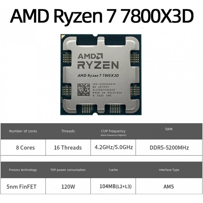 AMD Ryzen 7 7800X3D — высокопроизводительный процессор с 8 ядрами и 16 потоками, базовой частотой 4.2 ГГц и технологией 3D V-Cache (96 МБ L3). Построен на архитектуре Zen 4, поддерживает DDR5 и PCIe 5.0, обеспечивая максимальную производительность в играх и требовательных задачах.