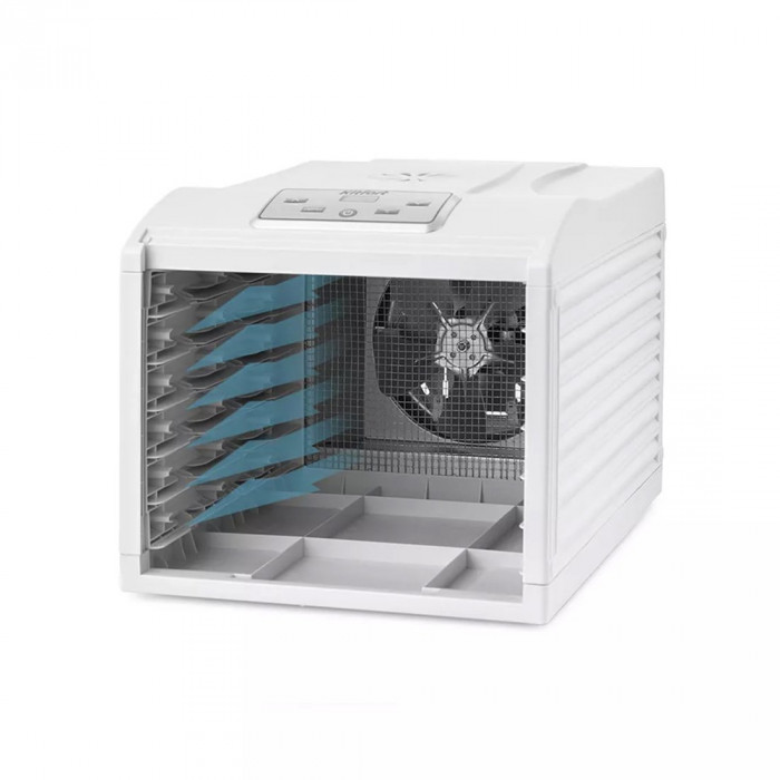 Сушилка оборудована большим мощным вентилятором, что обеспечивает равномерный горизонтальный обдув всех 6 поддонов. Поток воздуха направлен горизонтально, поэтому запахи продуктов с разных поддонов не смешиваются.Понятное управление