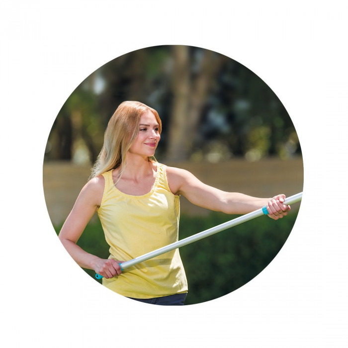 Телескопическая ручка используется совместно с насадками для чистки бассейна, диаметр крепления которых составляет 26.2 мм. С ее помощью можно добраться до самых удаленных и труднодоступных уголков. Основная часть рукоятки изготовлена из алюминия, благодаря чему отличается прочностью и небольшим весом.