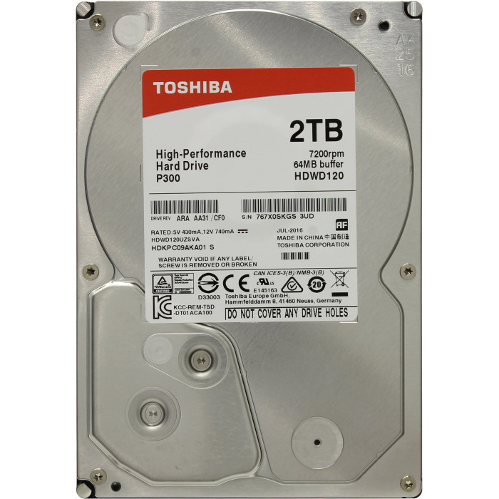 2 ТБ Жесткий диск Toshiba P300 [HDWD120UZSVA]. Жесткий диск Toshiba P300 разрабатывался специально для использования внутри настольных ПК. Для ноутбука такой HDD подойдет плохо, зато владельцам стационарных машин отлично послужит, ведь 2-терабайтного Toshiba P300 вполне хватит для хранения даже громадных мультимедийных коллекций. Под стать объему и скорость комплектующего. Делающий в минуту 7200 оборотов шпиндель гарантирует быстродействие носителя. Несмотря на скорость, диск издает не так уж много шума: в режиме простоя этот показатель равен 27 дБ. При этом при работе шум возрастает всего на одну единицу, до 28 дБ, что не может не радовать. Носитель оснащен интерфейсом SATA третьего поколения, что позволяет ему обрабатывать данные со скоростью, достигающей 6 Гбит/с – впечатляющий показатель, недостижимый в предыдущих версиях SATA. Емкий (64 МБ) кэш позволяет избежать простоев в работе и в целом способствует эффективности работы HDD.