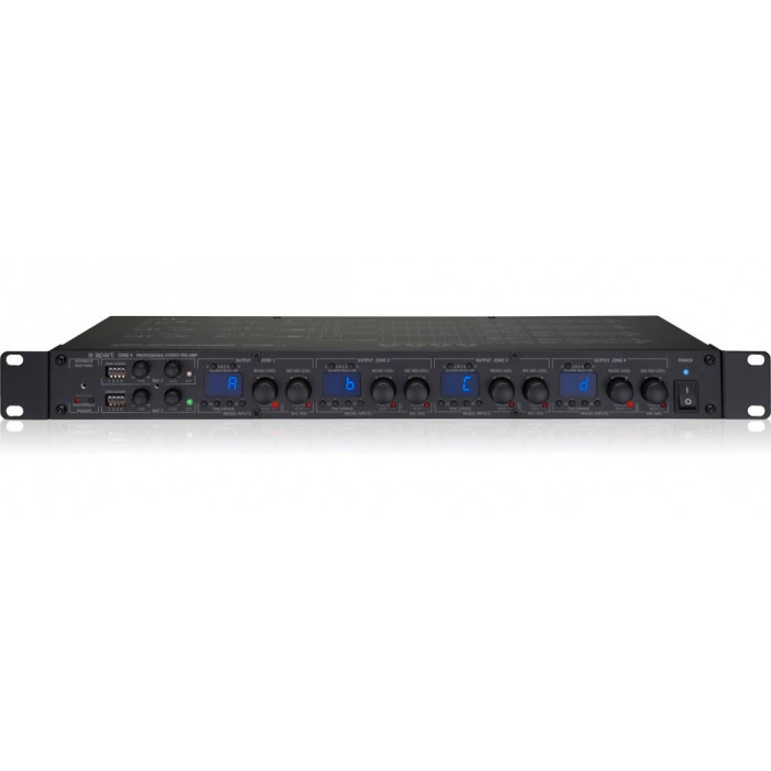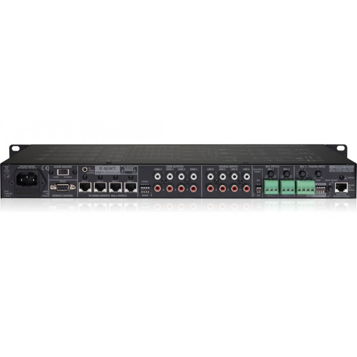 Микшер-предусилитель (3 микрофонных + 4 линейных входа) x 4 линейных выхода. входные сигналы можно коммутировать с любым линейным выходом предусилителя. Управление с передней панели или с удаленных контроллеров ZONE4R (до 8-ми), подключение микрофонных станций с селектором на 4 зоны MICPAT-4 (всего до 4-х), управление по RS232. MIC1 приоритетный. Питание предусилителя 220В АС.